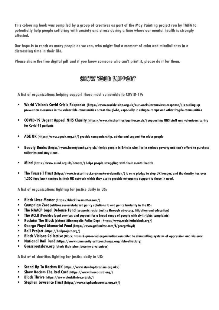 The colouring book below was compiled by a group of creatives as part of the May Painting project run by TMFA to potentially help people suffering with anxiety and stress during a time where our mental health is strongly affected.