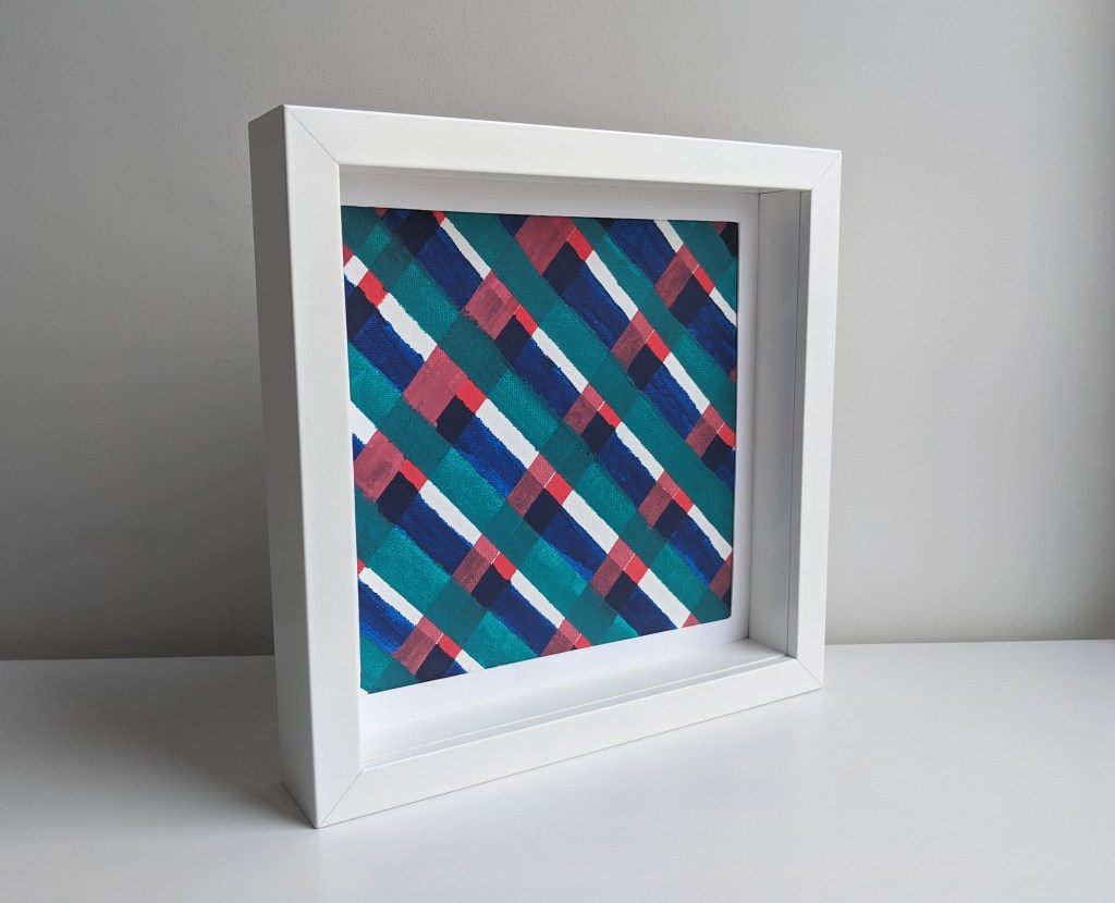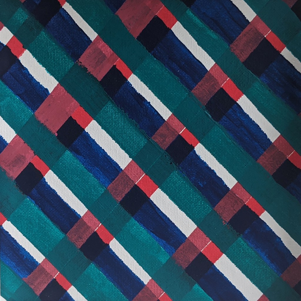 This was an experiment in an attempt to ‘replicate’ computer-generated patterns. As a result, there are several ‘imperfections’ coming out of this process but the analogue actions offer a unique ‘depthness’ to the painting due to the mix of multiple layers of acrylic.