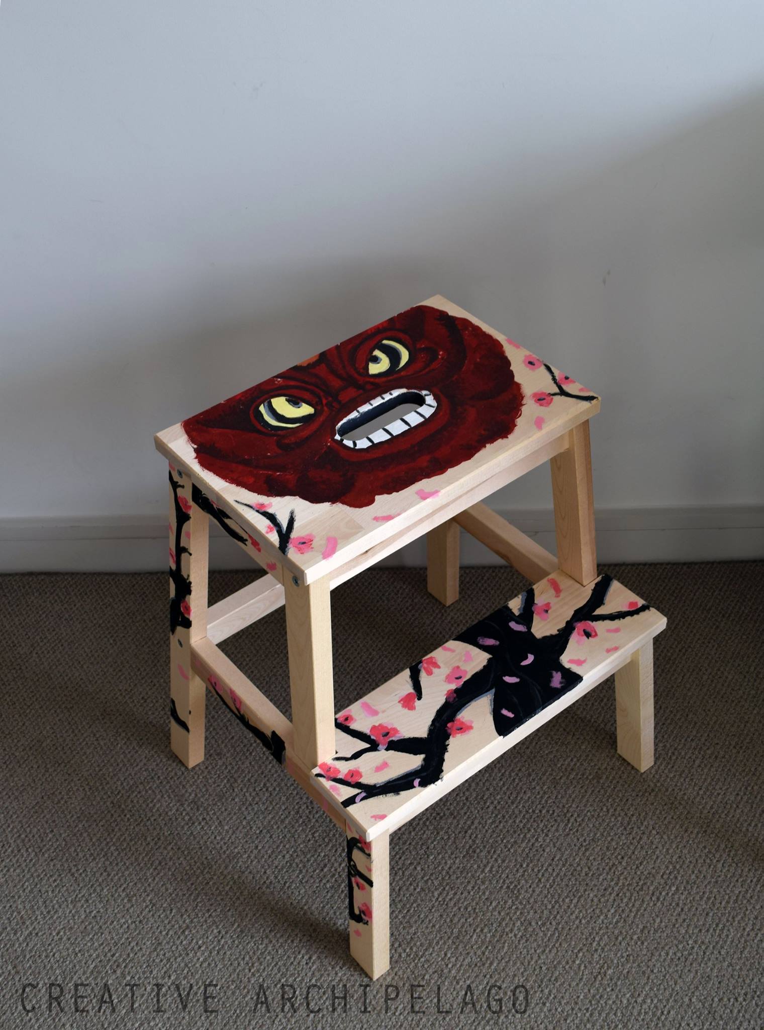 The Guardian is a hand-painted solid birch step-stool which can be used as a night-stand, step-stool, end-table and many other things