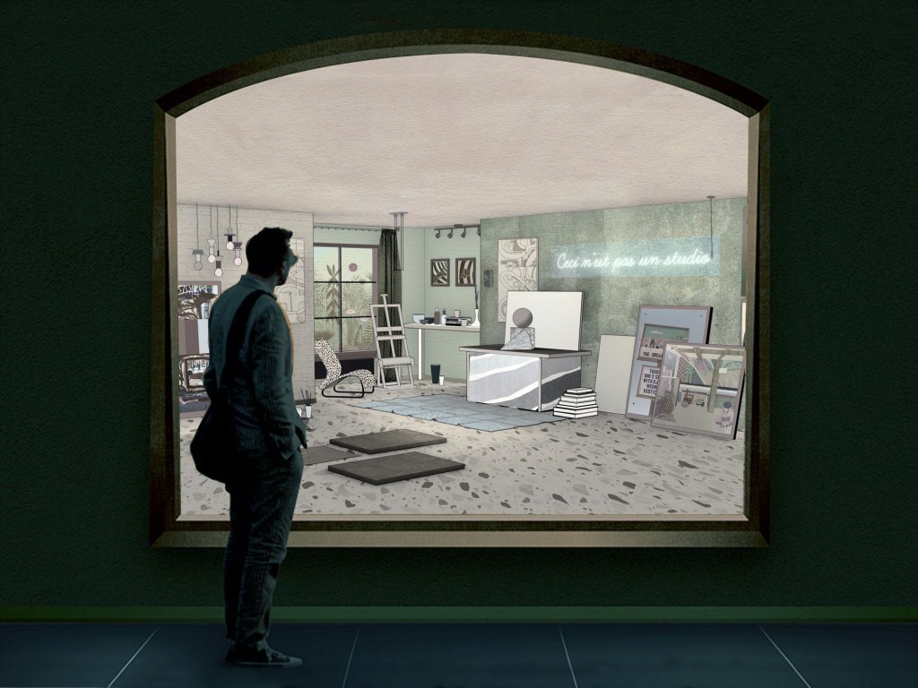 This drawing imagines the representation of the studio as an exhibit of the future. The museum diorama setting acts as a faux terrain in the foreground, which alters the reading of the drawing’s intention. This is part of the ‘May Painting’ series that came out of a collaboration with Matty Mo (The Most Famous Artist). The ‘May Painting’ project is an international internet-based co-creation laboratory, bringing together over 50 makers, artists, collectors, thinkers, and doers to share insights and experiences, exchange ideas and help shape the vision for a culturally relevant artwork. Investigating the subject of the artist’s studio, the series imagines the dream studio as a space of creation, a place of experimentation and as a state of mind.
